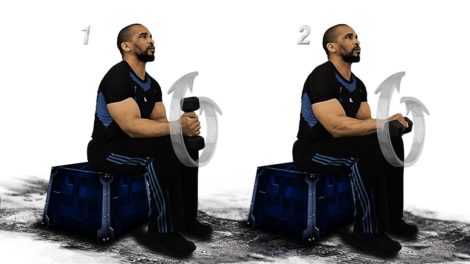 With a light dumbell in each hand, start with forearms parallel to the floor with palms facing down. Rotate wrists so palms face the ceiling then rotate back, that is one rep. Do this as slowly as possible.